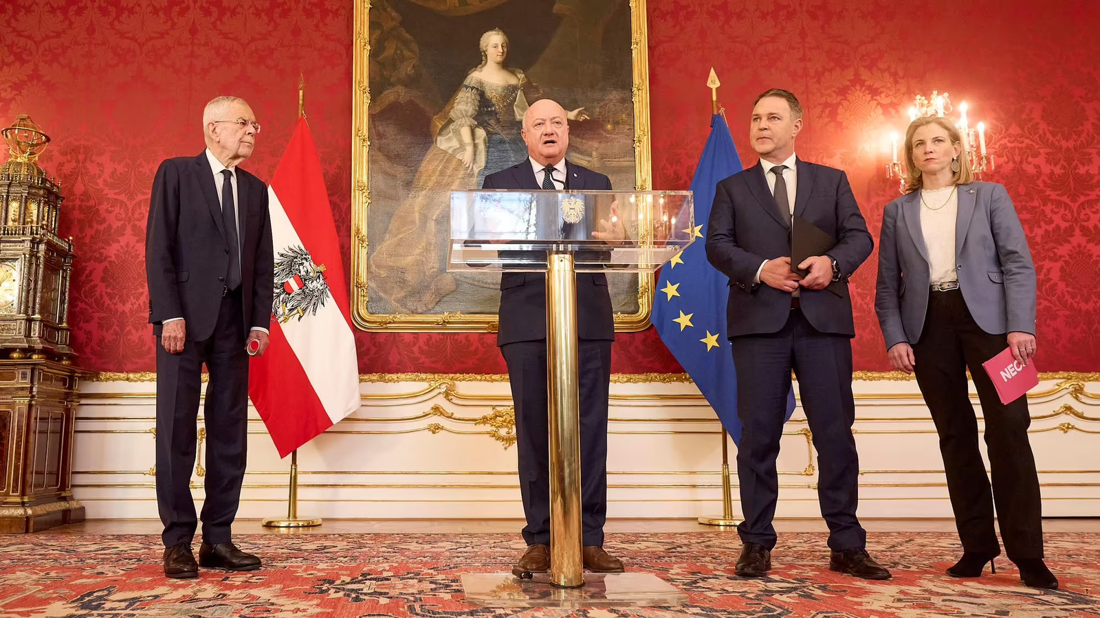 Bundespräsident Alexander Van der Bellen, Grüner und erbitterter Kickl-Gegner, weigert sich, ihn zum Kanzler zu ernennen. Er setzt die berühmte „Brandmauer“ und beauftragt Karl Nehammer (ÖVP) mit der Bildung einer Koalition ohne FPÖ. Ziel: ÖVP + SPÖ + NEOS.